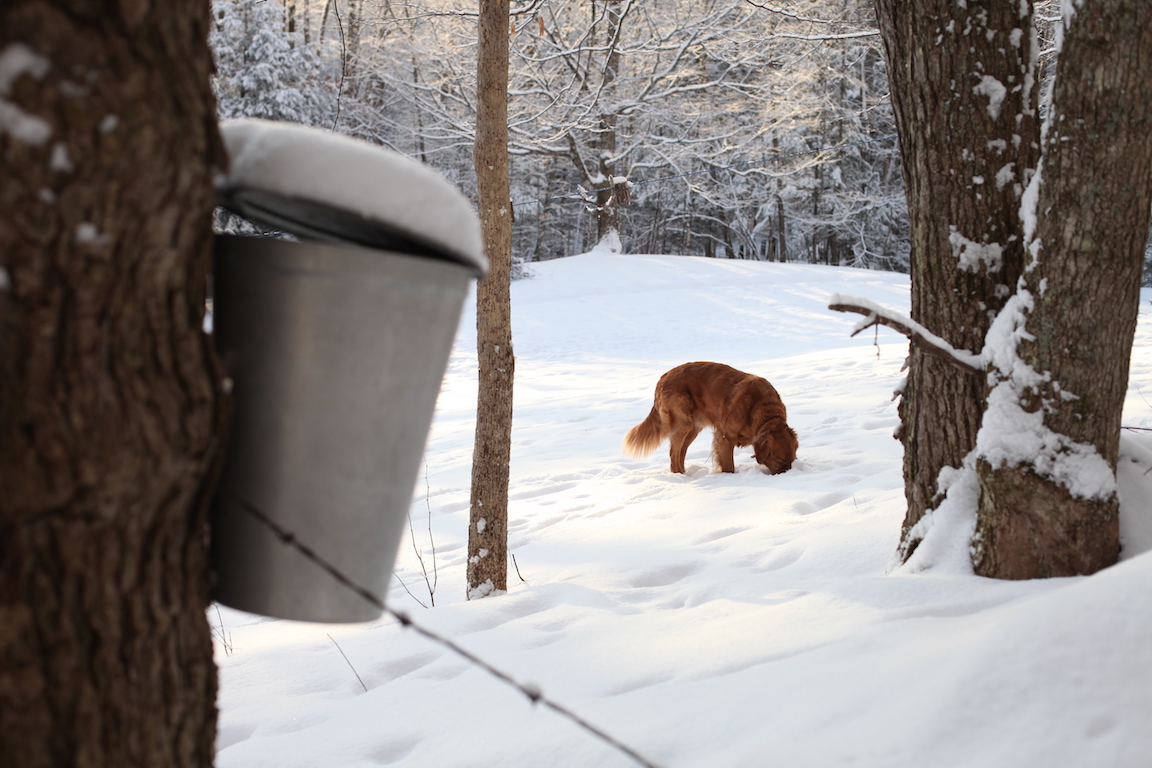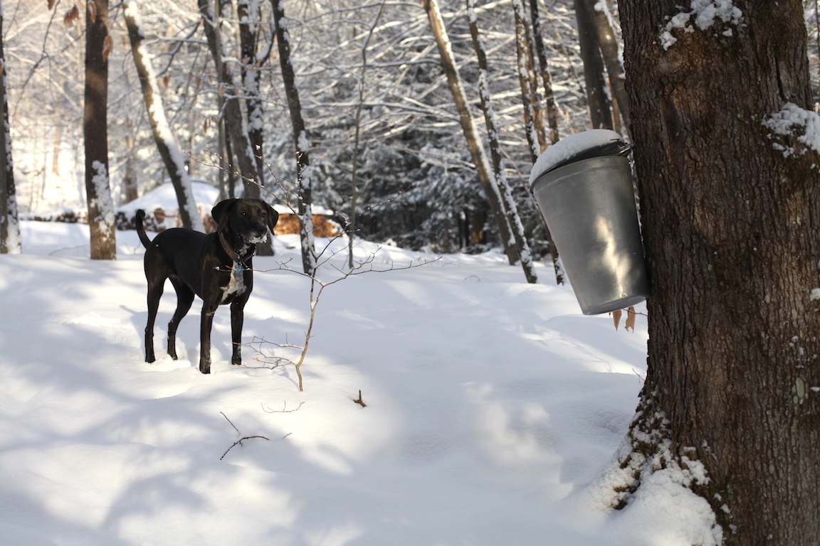 February in Vermont has gotten a bit slushy and a tad icy with the freeze-thaw cycles of the last couple of weeks. Lucky for us that means it’s time for tapping (some of) our maple trees. In total we’ll have 21 taps this season, up a couple from last year. Here are photos of our taps with a fresh dusting of snow and the companionship of yurt dogs. Don’t count the taps—we still have a handful to put in…